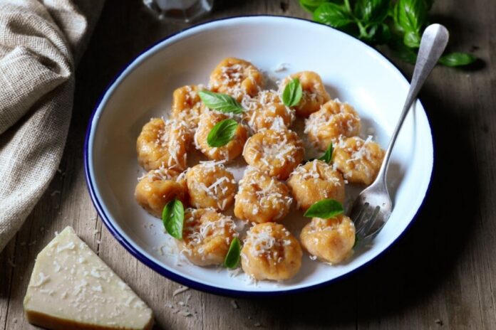No liquidificador, bata o arroz cozido com os ovos, o leite e o cheiro-verde. Coloque a mistura em uma panela e leve ao fogo médio. Adicione a farinha de trigo e misture até soltar do fundo da panela. Enrole a massa em uma superfície enfarinhada com farinha de trigo e corte em pedaços pequenos. Em uma panela, cozinhe os nhoques em água fervente, em fogo médio, até que subam à superfície. Retire e sirva em seguida. Rende aproximadamente 10 porções.