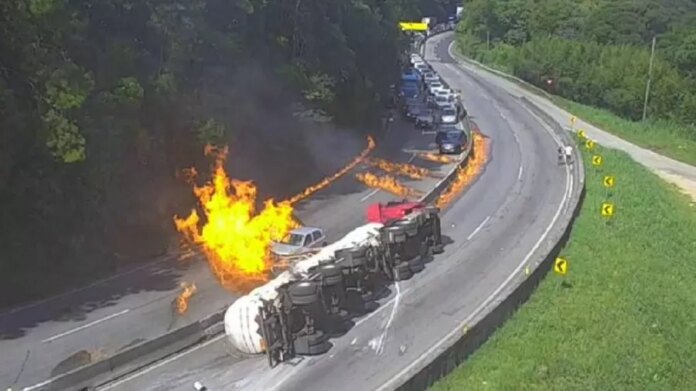 O caminhão tombou e explodiu no km 233. Um vídeo das câmeras de segurança da rodovia mostram o exato momento em que o veículo realiza a curva, tomba e causa um incêndio de enormes proporções. A BR-101 é o principal corredor viário de Santa Catarina.