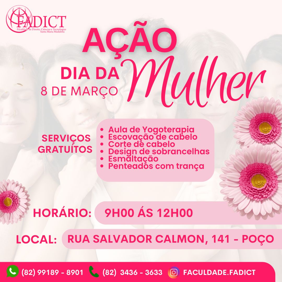Neste sábado, dia 8 de Março, quando comemoramos o Dia da Mulher, das 9h às 12h, a Fadict vai dedicar um gesto de carinho e fortalecimento da autoestima, através da oferta dos serviços de embelezamento e saúde aferição de pressão medição de glicose, corte de cabelo, escova, esmaltação de unhas e até Yoga. Será uma manhã especial onde todas receberão serviços de qualidade feito pelos professores de cursos técnicos e profissionalizantes da instituição.