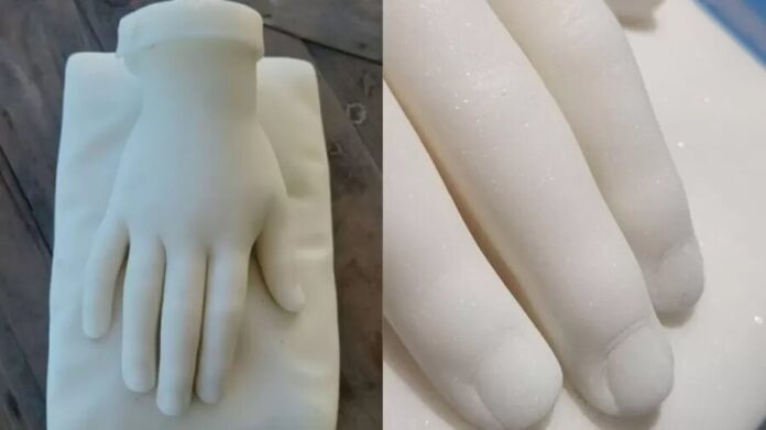 A escultura retrata a mão de uma criança. Ali Noble se interessou pela peça para treinar suas habilidades com tatuagem e nem percebeu que se tratava de um item feito em mármore.