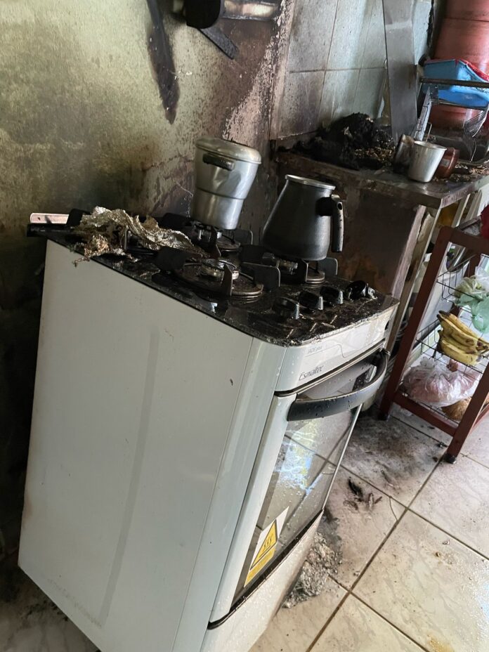 Imagens do local mostram a cozinha destruída pelas chamas, que teve danos na parede, em móveis e no forro de pvc do teto do cômodo. Veja abaixo: